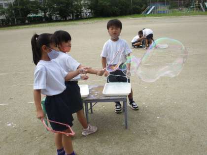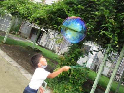 ハンガーでも挑戦!かなりコツがいりましたが,とっても大きなしゃぼん玉ができました!!