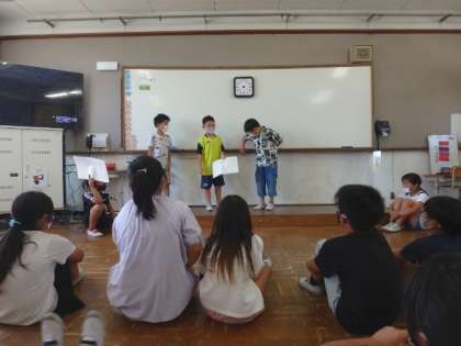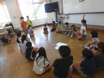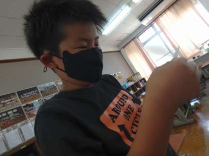 「人狼」というゲームをしました。ルールが複雑で難しいのですが,自分たちで声をかけ合って上手に進めることができていました。
