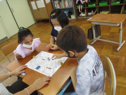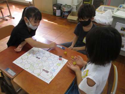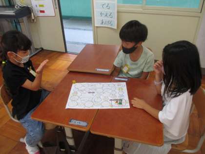 夏休みの出来事を話しながら進む「夏休みすごろく」をしました。「夏休みに食べたもので一番おいしかったものは?」「夏休み一番楽しかったことは?」など,それぞれのマスに書いてあることを話しながらゴールを目指します。すごろくを通して,それぞれの夏休みの思い出をたくさん聞くことができました♪