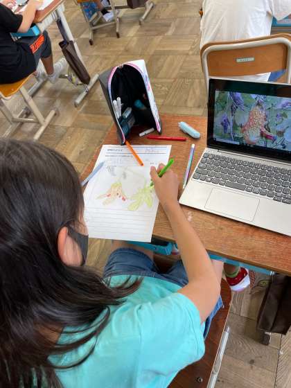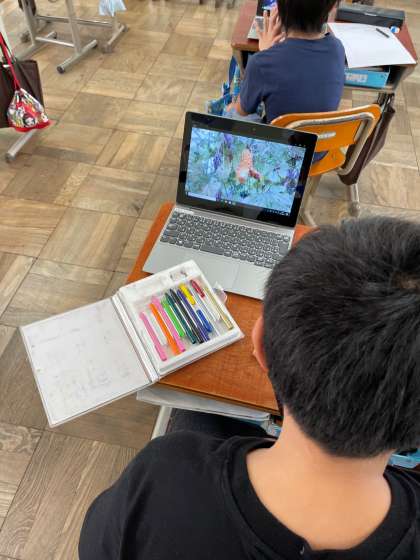 夏休みが終わり,みんなが大切に育てていたツルレイシはどのように変化しているのか,写真を撮り観察をしました。葉や実の様子をじっくりと観察し,カードにまとめていました。