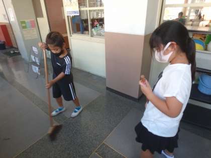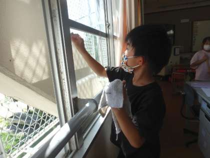 2学期初めての掃除です!見えないところには夏休み分のほこりや汚れが…。クラスの全員が一生懸命取り組み,教室がとってもきれいになりました!
