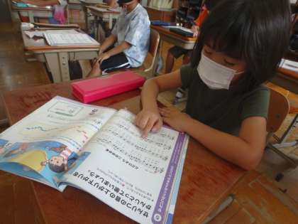 「イ」のパートでは,歌声とリコーダーが重なります。この日は,リコーダーの音を確認し運指の練習をしました。