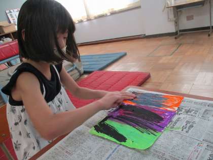 クレパスを何色も重ね塗り,最後は黒のクレパスで真っ黒に塗ります。