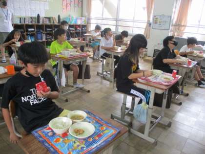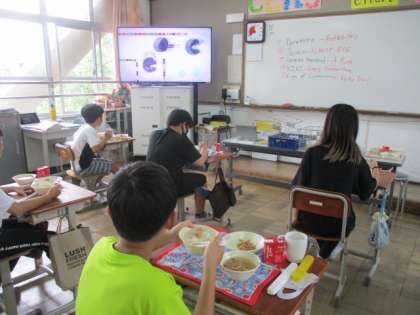 給食時間にアンドリュー先生が来てくださり,お気に入りの英語の曲を教えてくださいました。洋楽を聴く機会があまりないようで,興味津々に聴いていました。