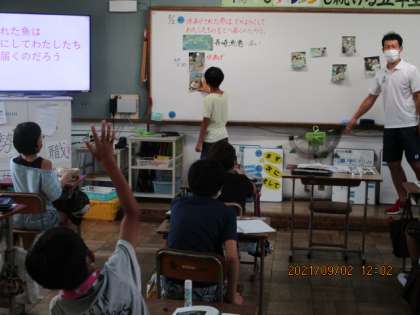 水あげされた魚はどのようにして私たちのもとに届くのかについて学習しました。切り取った写真をつかってみんなで意見を出し合いながら問題を解決することができました。