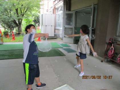 あいにくの雨でしたが,屋根のある場所でしゃぼん玉あそびをしました!