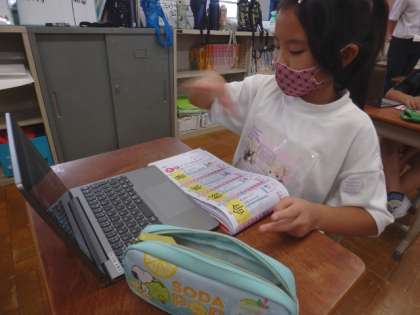 Zoomを使って,先生が離れた場所から課題を伝えて取り組みました。子どもたちは話をしっかりと聞いて,漢字やデジタルドリルの課題に取り組むことができました。