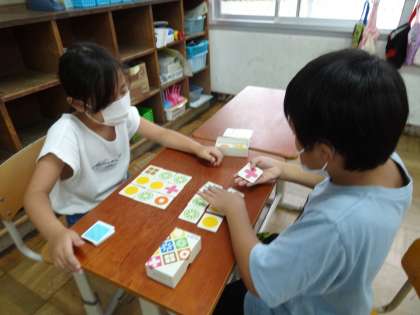 子ども達は教室でおとなしく室内遊びをしながら過ごしていました。