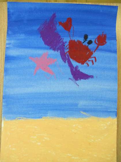 昨日の図工に引続き,グラデーションの背景に生き物や建物の絵を描いて,作品を仕上げました。