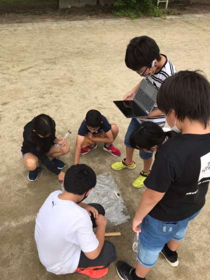 今日は運動場に行き,雨水がどのように流れているのかを調べていきました。