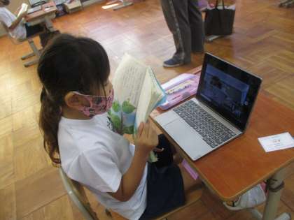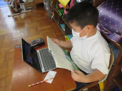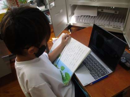 「やくそく」の音読の練習をしています。登場人物になりきって読む工夫をしているのですが,タブレットで自分の音読を録画し,聞いて,さらに良くなるよう工夫するという流れで練習を進めています。