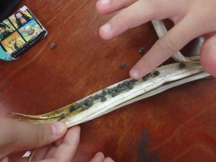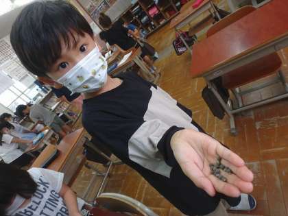 授業の後,干からびてしまったオクラの中をみんなで確認しました。「絶対種が入ってるで!」と子どもたち。「1つのオクラから50個くらい種が出てきた!」と大喜びでした。