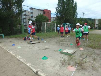 この日は体ほぐしの運動の時間に,「1・2・3」のリズムで跳ぶ練習や,「3」の時に踏切版を強く踏んで跳ぶ練習をしました。