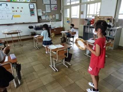 リズムをとりながらタンバリンやカスタネットをたたいたり,実際に音符や休符を書いてみたりしました。