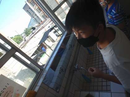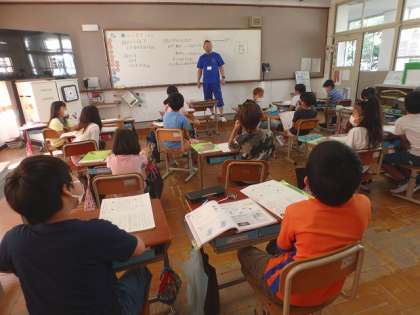 子どもたちから「糸電話の糸が長くなっても,声は聞こえるの?」という疑問が出たため,実際に校舎の間に糸を張り,話してみることに!