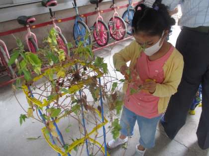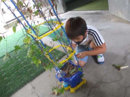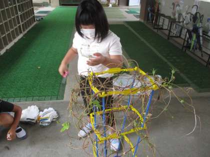 あさがおのツルでリース作りをしよう!!ということで,ツルから葉っぱを全て切り,支柱からツルを外しました。ぐるぐるに巻き付いているツルを外すのには大苦戦!!皆で助け合いながらツルを外しました。