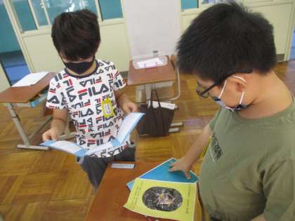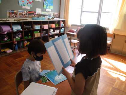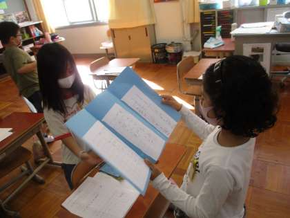「うみのかくれんぼ」の学習で作った生き物カードの交流をしました。自分で調べた生き物の隠れ方をしっかり友達に伝えることができました。