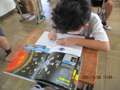 月と太陽の学習の最後にもっと自分で調べたいことについて図鑑やタブレットや教科書を使って調べてノートにまとめました。