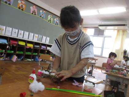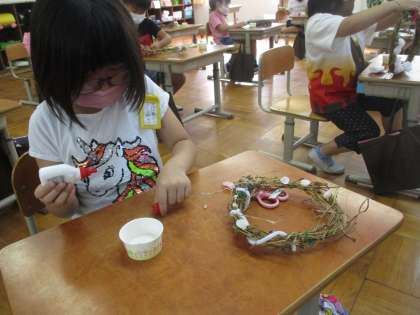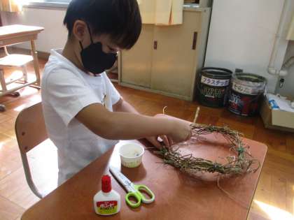 朝顔のリースに飾りつけをしました。みんな夢中で作っています。