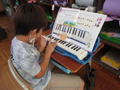 鍵盤ハーモニカの練習をしています。指を間違えないように頑張っています。