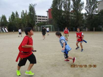 タグを二つとも取られてしまい動けなくなっていると,同じチームの友達がタグを分けに来てくれました。優しいですね!