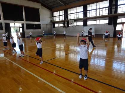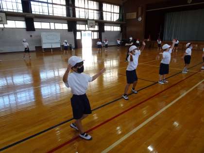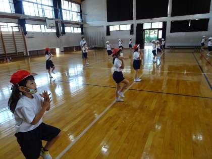 運動会にむけての低学年のダンス練習では,隊形移動を取り入れて練習をしました!体型が変わってもしっかり踊っています!