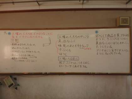 工場で働く人がどのようなことに気を付けて働いているのかを調べました。映像の資料の細かいところにまで目を向け,気付いたことを話し合う姿がすてきでした。