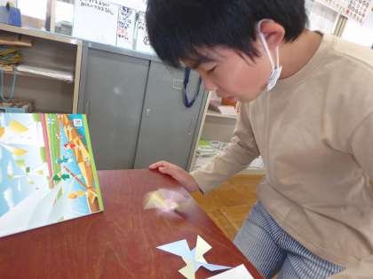 「円と球」の学習の初めに,ふきごまを回し,こまの模様が円い形になることを確かめました。