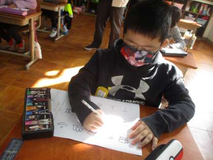 どうやって漢字ができたのかを考えています。「この絵からこの形に変わって,この漢字ができた!」とプリントで線つなぎをしました。