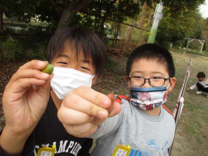 生活の「あきといっしょに」の学習で,どんぐり集めをしました。大きいどんぐり,小さいどんぐり,太いどんぐり,細いどんぐりなど,色んなどんぐりを集めました。