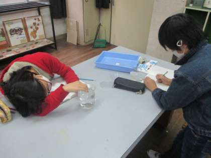 まずは,食塩をルーペで拡大して観察し,一つ一つは透明で四角い形をしている事を知り,その後,とけていく様子を一人一人じっくり観察して調べました。