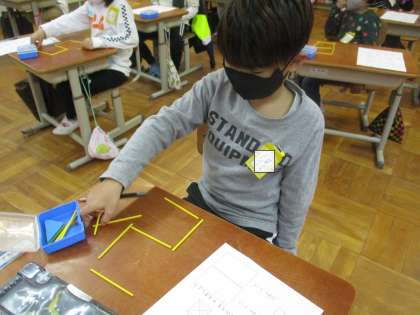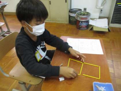 棒で作った8という数字から棒を1本〜2本とって別の数字を作ろう!ということに挑戦しました。真ん中の棒を1本とったら0になったり,左側の縦の棒を2本とったら3になったりと色んな数字を作ることができました。