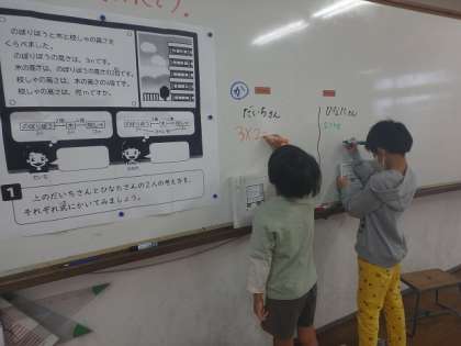 かけ算の計算の順番を変えても,答えが同じになることを確かめました。( )を使って式を立てるのが難しかったようですが,関係図を見ながら数字の意味を考えて式を立てました。