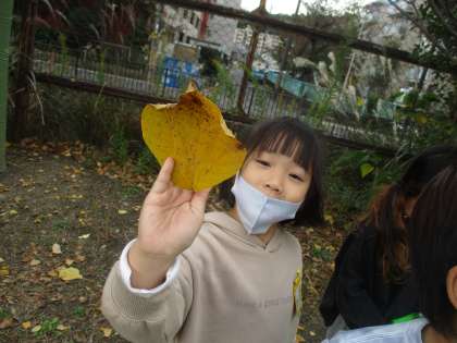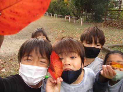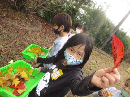 秋の葉っぱを集めに行きました。きれいな色の葉っぱ・小さい葉っぱ・大きい葉っぱなど,様々な葉っぱを集めました。