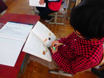 文章の「中」を読んで筆者の書き方の工夫について考えました。それぞれの段落で答えがどの部分に書かれているかや段落の順番について考えました。