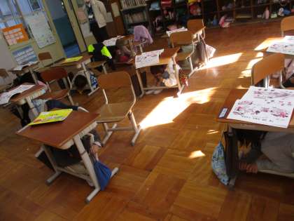 地震・火災が起こったときの避難訓練をしました。放送をよく聞き,「おはしもて」をしっかり守って避難することができました。