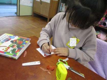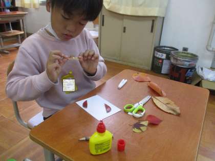 落ち葉を使ったしおり作りをしました。自分が見つけたお気に入りの落ち葉を紙に貼っていきます。
