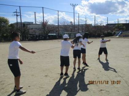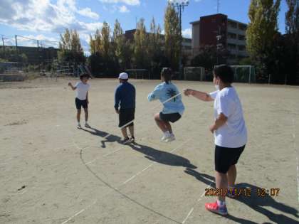 グループでいっせい跳びと8の字跳びに挑戦しています。