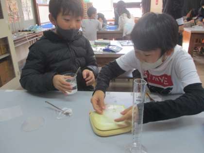 前回の学習で,ものが溶けるには限度があるということを知った子ども達は,さらにものを溶かすためにはどうしたらいいのかというアイディアを出し合い,「水を増やせばいいんじゃないか」という考えが出てきました。