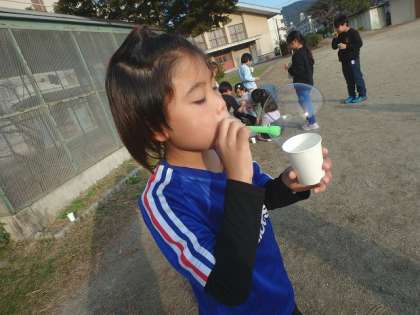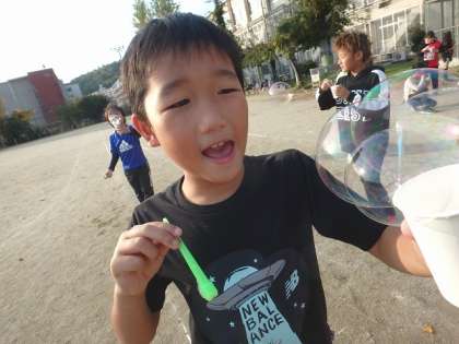 「いろいろうつして」の学習でシャボン玉をしている自分を紙版画で表します。今日はシャボン玉をしている楽しそうな表情を写真に撮りました!