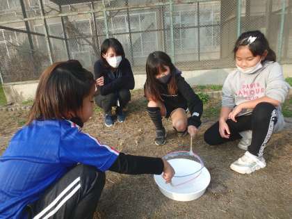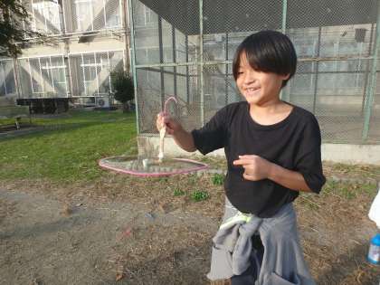 せっかくなので大きなシャボン玉作りにもチャレンジ!「ガムシロップ」を入れると割れにくくなるそうですよ!