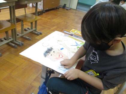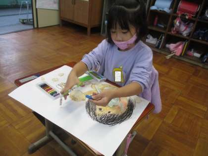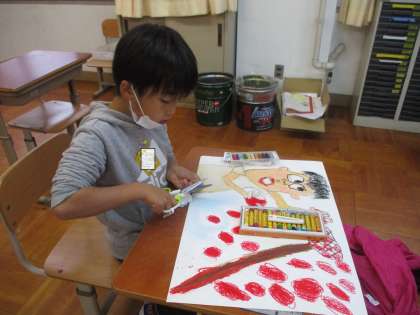 玉入れの絵の背景をコンテでぼかして色づけしました。ハサミでコンテを削ってから,ティッシュでこすると,淡くきれいな色がでます。