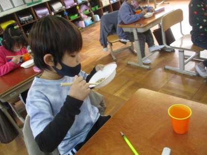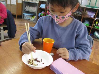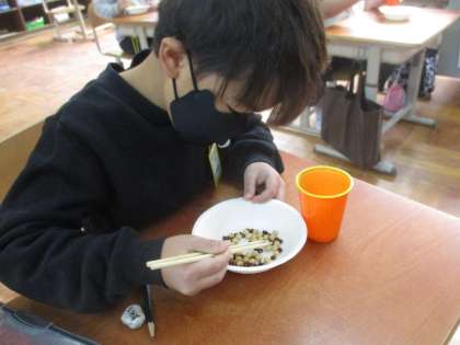 今日から給食週間ということで,給食調理員さんにお手紙を書いたあと,お箸の使い方で豆つまみ体験をしました。