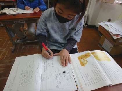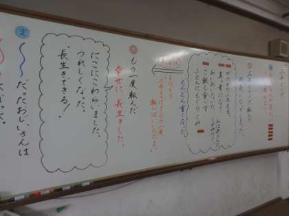 物語のはじめと終わりで,おじいさんの様子がどのように変わったのかについて話し合いました。本文に書かれている「真っ青になった」や「しがみついた」の言葉の意味も考えながら,おじいさんの様子について考えました。