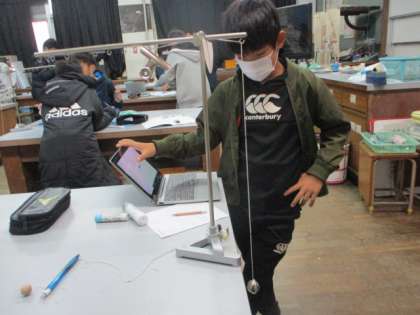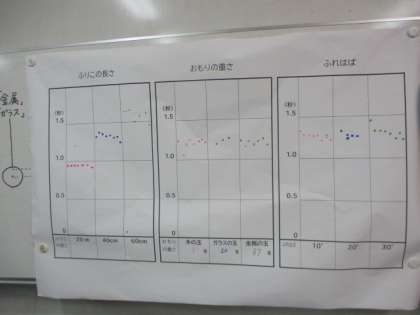 今日のふりこの学習は「ふれはば」を変えて1往復の時間が変わるのかを調べていきました。
