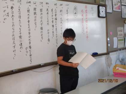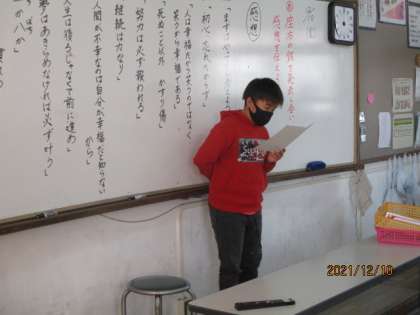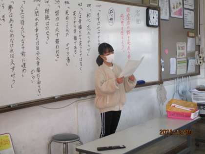 大切にしたい言葉の学習で自分の座右の銘を作文にして一人ずつ発表しました。それぞれのこれまでの経験や価値観があっておもしろかったです。