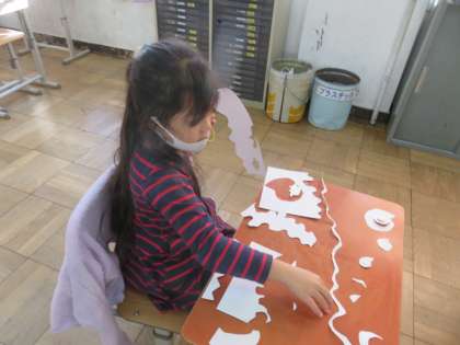 てきとうに白い紙を切り,切った形を並べて作品を作っています。