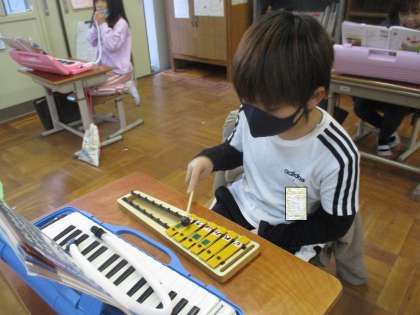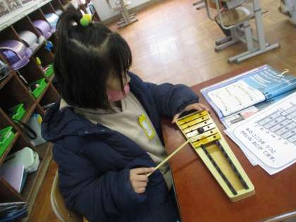 音楽の時間に,ミニグロッケンを使って「きらきらぼし」を演奏しました。今日初めてやったとは思えないぐらい上手に演奏することができました。