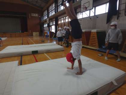 マット運動の学習も後半戦です!多くの子どもたちが倒立前転の技に取り組んでいます。この日もお手本と自分の技の様子を見比べながら学習に取り組みました。