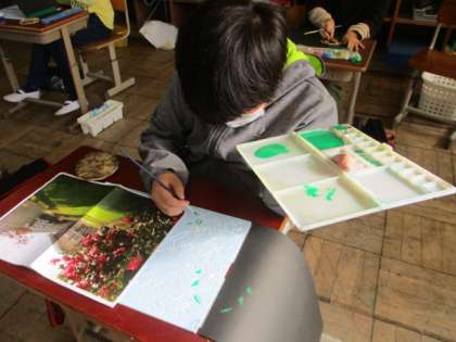 一版多色刷りは,1色ずつていねいに色を重ねていかなければならないので,根気がいりますが,完成に向けてていねいに頑張っています。